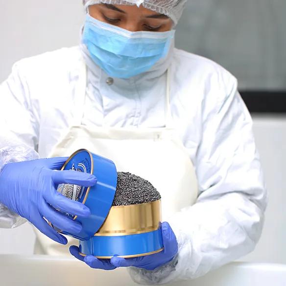 Nous travaillons le produit dans un laboratoire aux normes internationales. Au sein de celui-ci, sont prélevés les œufs de l’esturgeon. Ils sont ensuite tamisés, lavés et triés. Puis, ils sont délicatement salés selon une recette maison.